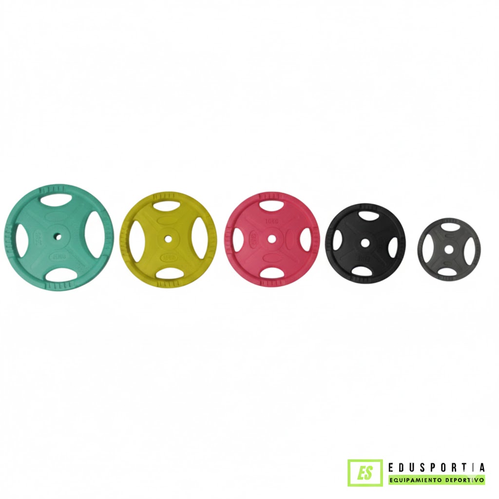 Están disponibles en los siguientes pesos: 1,25 kg, 2,50 kg, 5 kg, 10 kg, 15 kg y 20 kg.