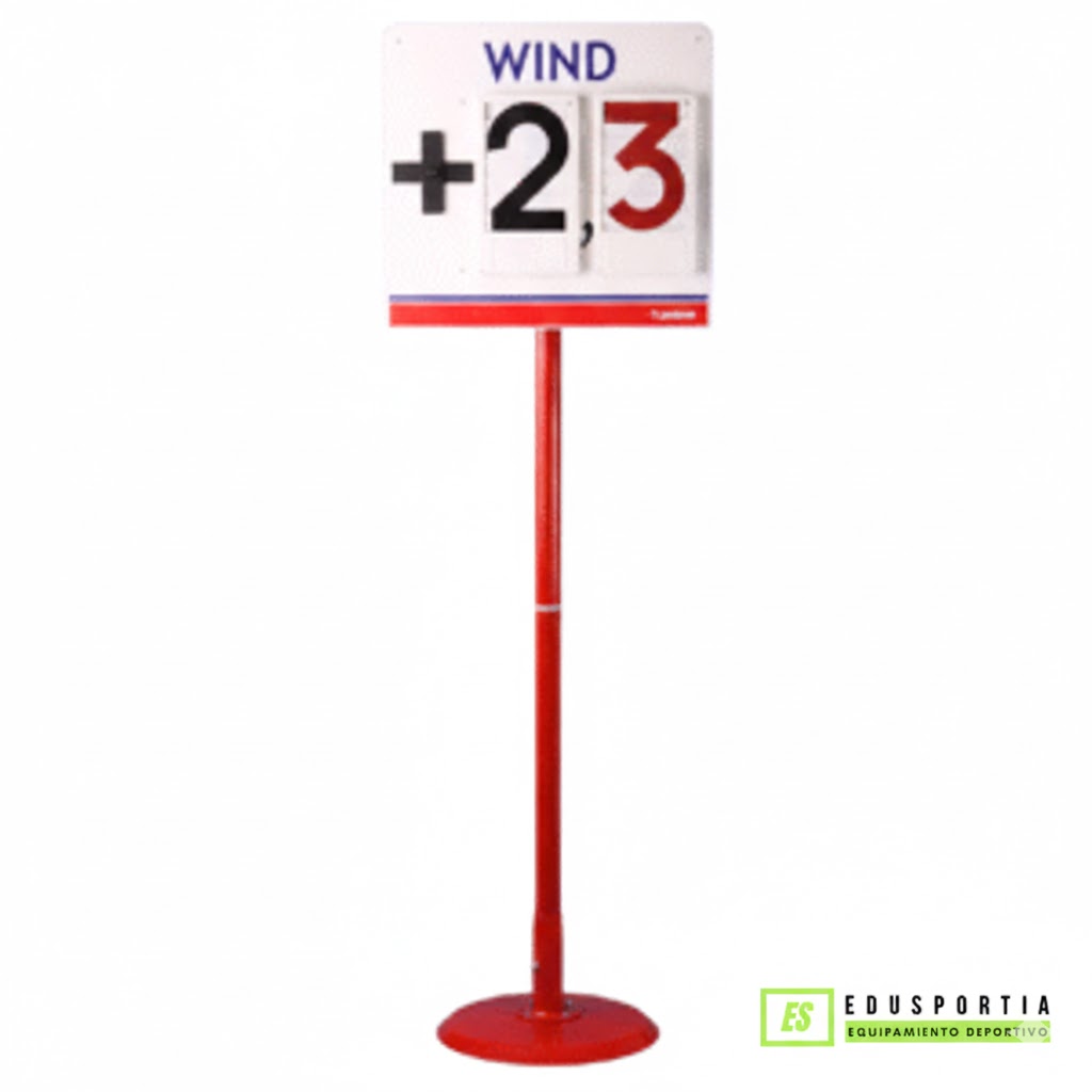Indicador de viento diseñado para saltos de longitud, triple salto y carreras, con construcción innovadora que permite un ensamblaje rápido y transporte o almacenamiento compacto.