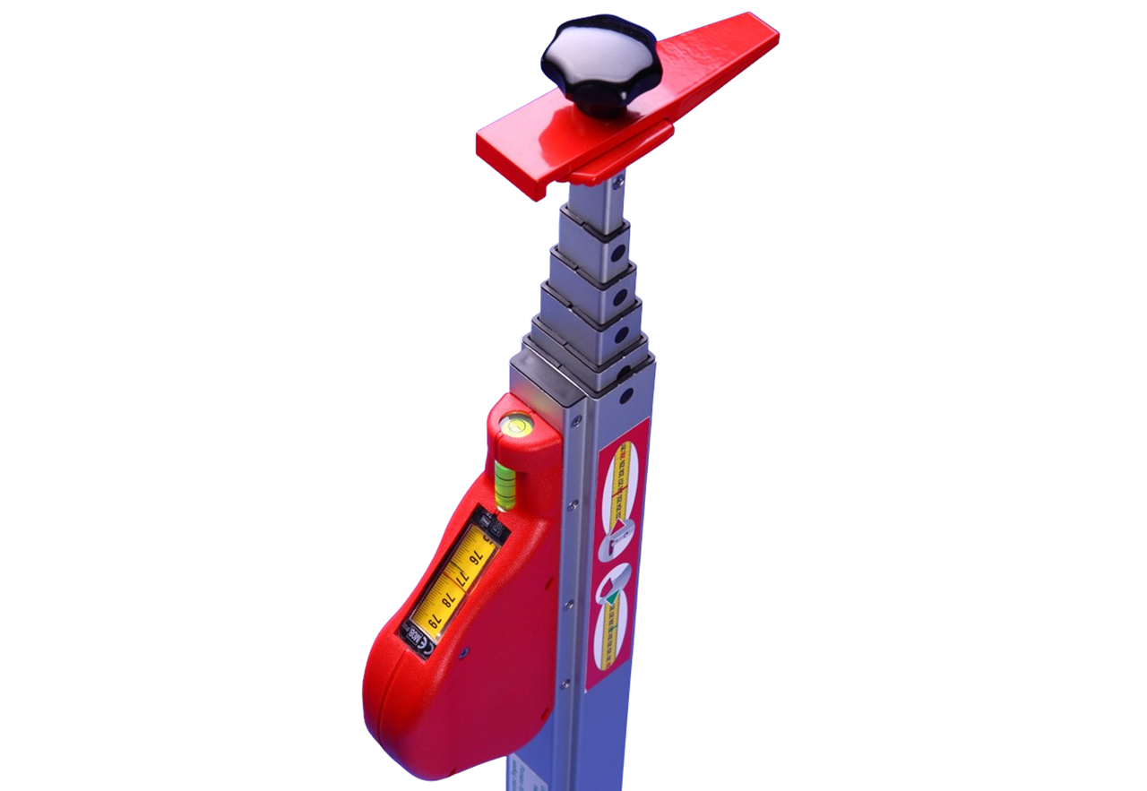 Fabricado en perfil de aluminio, telescópico, 6 segmentos, equipado con nivel, permite medir a la altura en que se encuentra colocado el listón. Regulable en altura del 67 cm hasta 3 m.