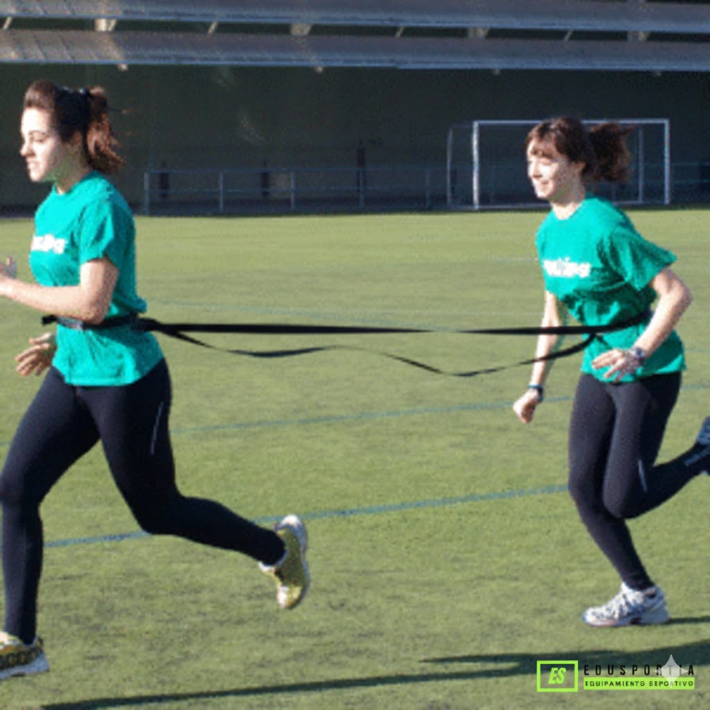 Este dispositivo de entrenamiento para parejas está diseñado para mejorar la velocidad y la longitud de zancada mediante resistencia controlada y progresiva. Cada atleta se sujeta mediante un cinturón con enganche giratorio conectado a un cordón de látex recubierto (Slastix) de 6,10 m, que proporciona un tirón constante pero seguro durante el ejercicio.
